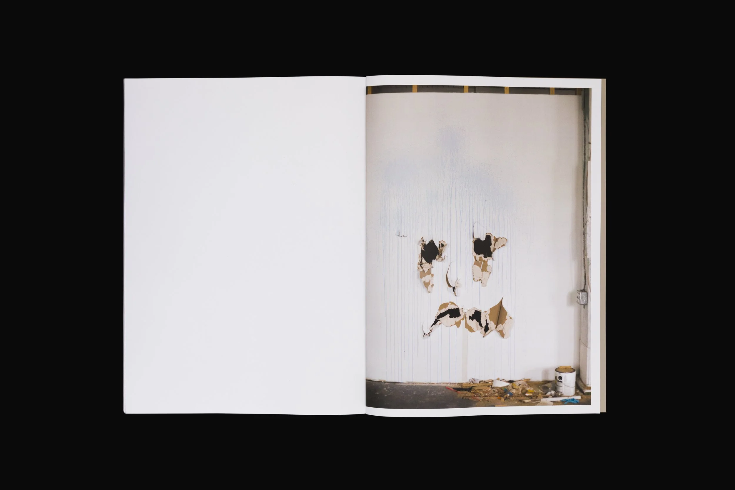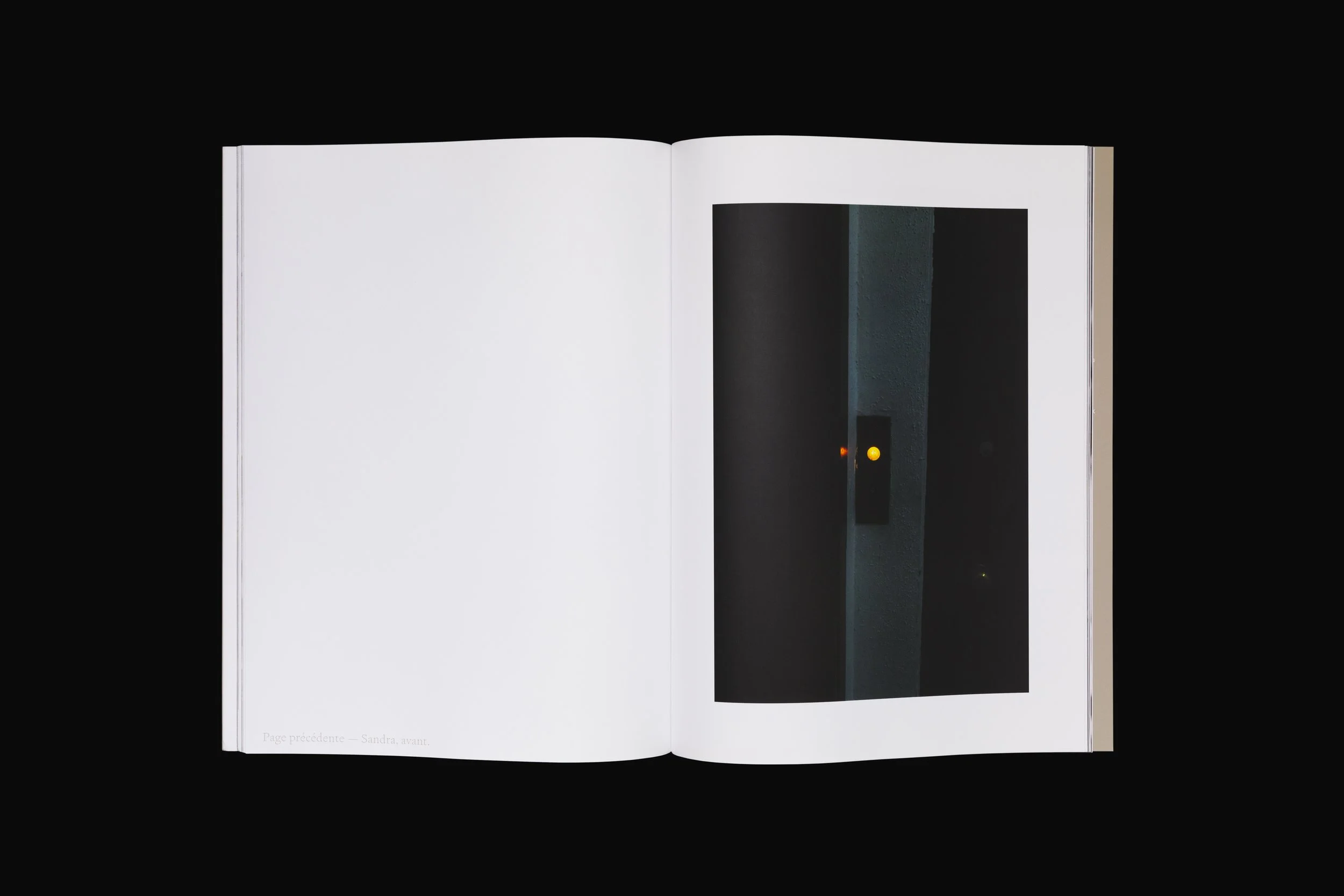 Livre d’artiste de la photographe Sandra Larochelle. Format surdimensionné, couverture en carton texturé avec rainures, et insertions de pages plus petites et de vélum. Photos — document original.