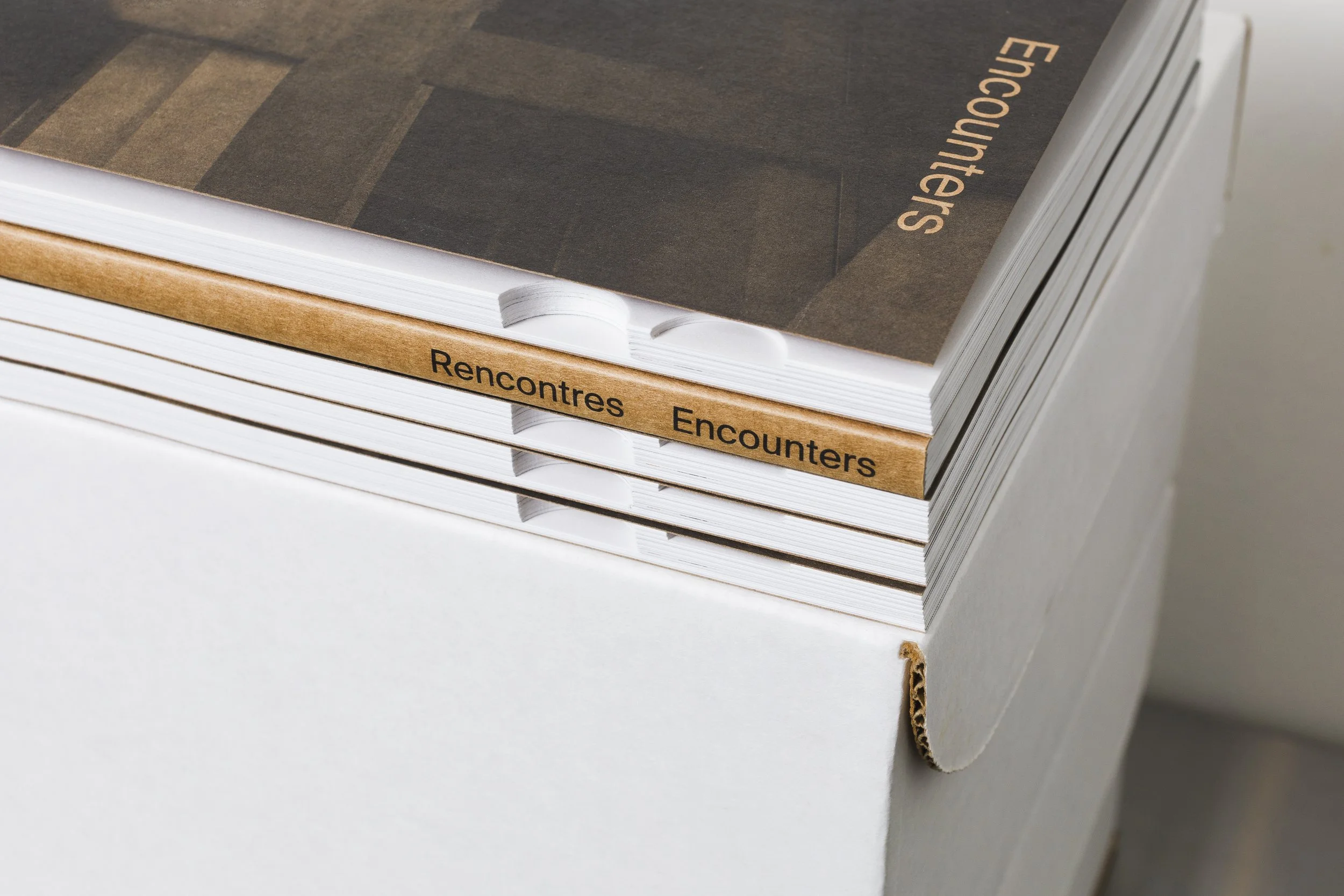 Catalogue bilingue de l’exposition Rencontres de Chloé Desjardins présentée au Musée d’art de Joliette. Couverture imprimée sur carton Kraft, onglet européens à l’intérieur. Photos — document original.